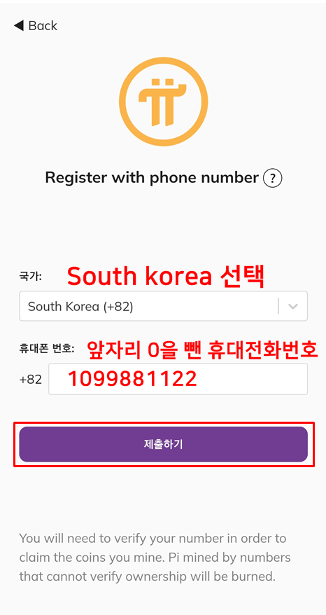 나의 휴대전화번호를 입력하여 줍니다.
